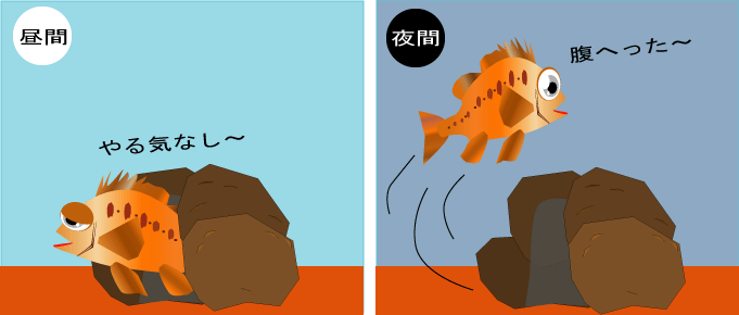 日中は隠れ家でじっとしてエサが流れてくるのを待っているロックフィッシュも夜間はエサを求めてナワバリの中をエサを求めて動き回ります。